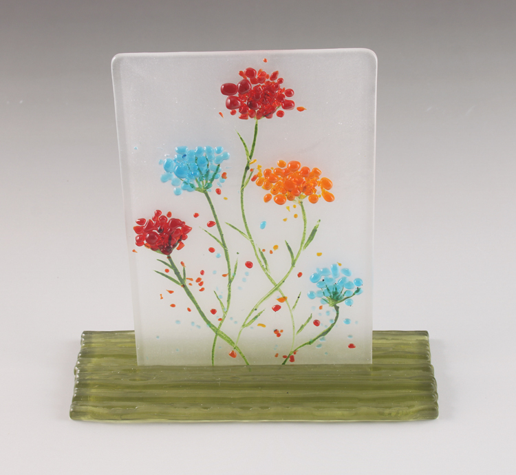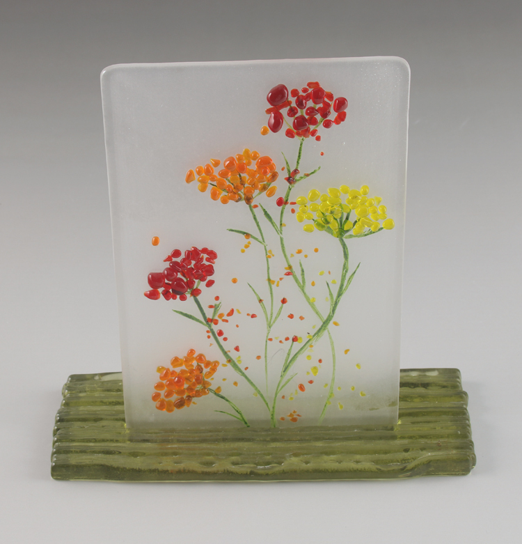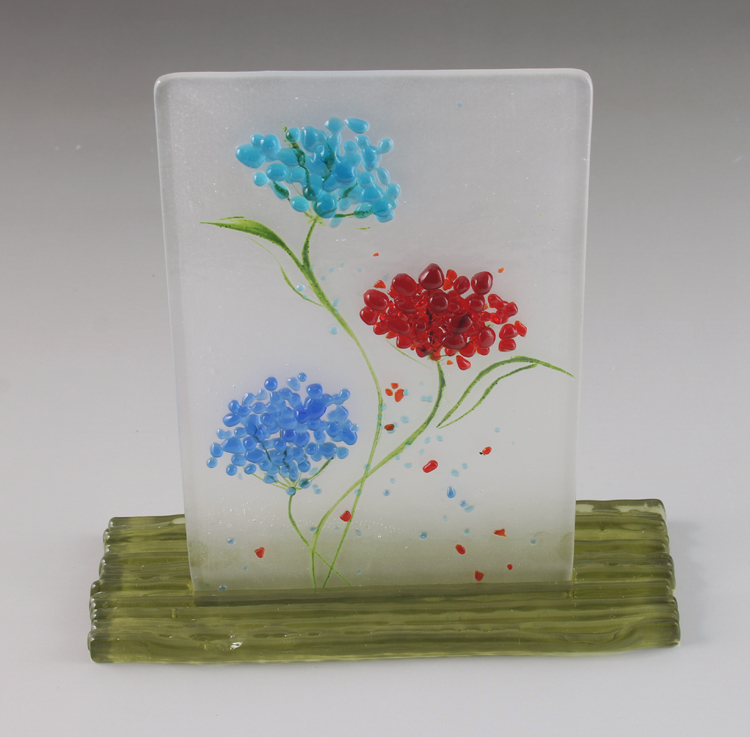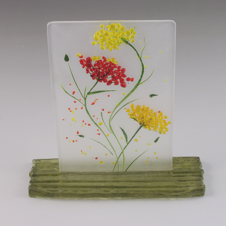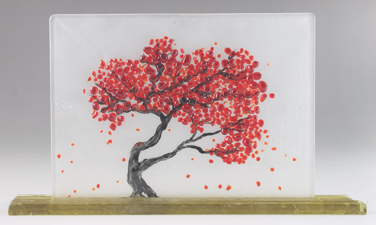 These panels feature glass frit carefully fused to a base, creating delicate representations of bouquets, Japanese blossom branches, and autumn trees. Each piece is handcrafted and unique, bringing a touch of nature’s beauty and color into your home or studio.