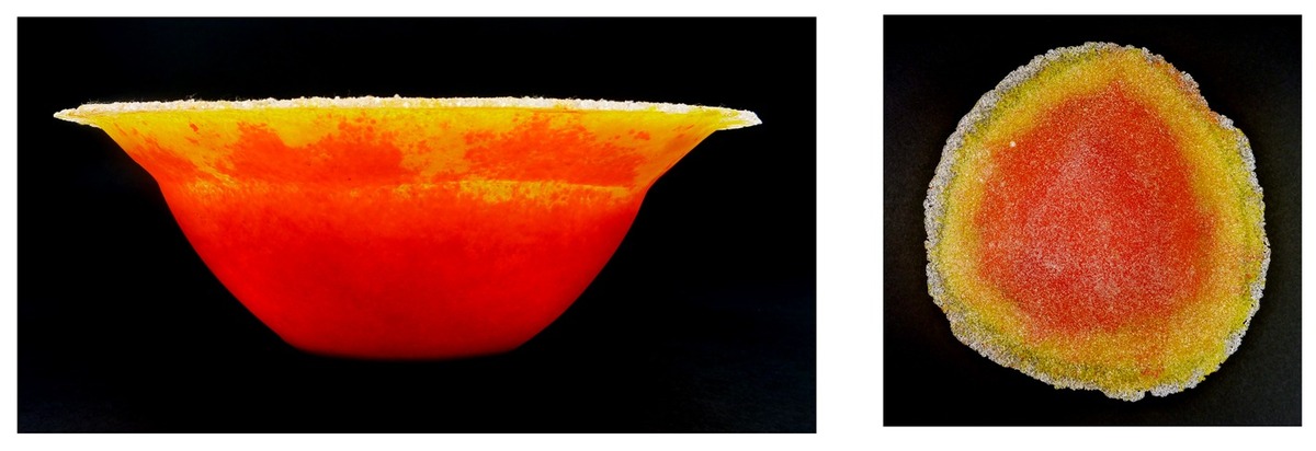Handcrafted bowls and platters in powdered glass. Some are cast, while others are hand-shaped, with heat creating openings and textures that make each work entirely unique.